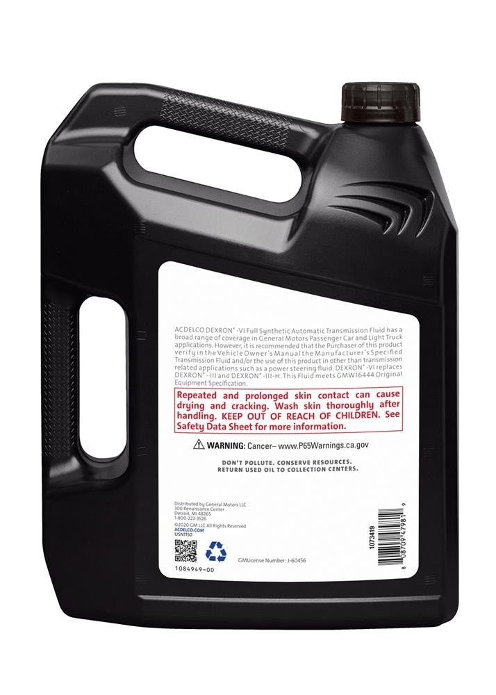 ACDelco GM Original Equipment DEXRON-VI Full Synthetic Automatic Transmission Fluids are designed, engineered, and tested to rigorous standards, and are backed by General Motors. They offer a full synthetic blend with premium quality and high performance. They help provide more consistent shift performance, even in extreme conditions, and degrades less over time. These automatic transmission fluids are specially formulated to help your vehicle's automatic transmission last longer and extends drain intervals. ACDelco Dexron VI Full Synthetic Automatic Transmission Fluid has been formulated to meet your expectations for durability and longevity. ACDelco GM Original Equipment parts are the true OE parts installed during the production of or validated by General Motors for GM vehicles. Some ACDelco GM Original Equipment parts may have formerly appeared as GM Genuine Parts (OE) or ACDelco Professional. ⚠<b> WARNING:</b> Cancer - www.P65Warnings.ca.gov | Dexron VI Full Synthetic Automatic Transmission Fluid - 1 gal