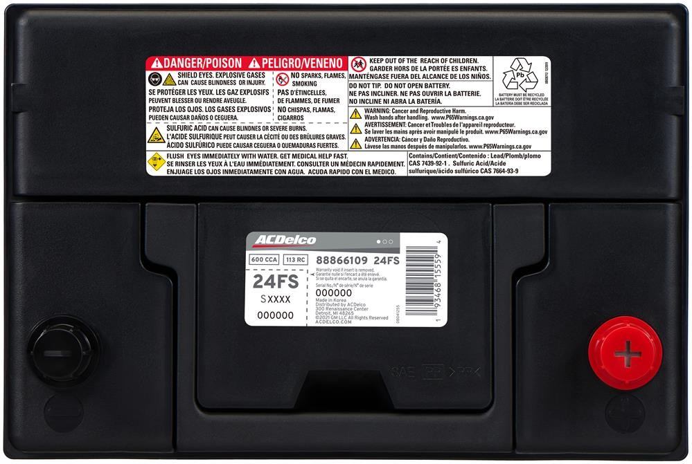 ACDelco Gold (Professional) Vehicle Batteries are a high quality alternative to Original Equipment (OE) parts. Featuring an impact- and break-resistant plastic case for durability, including robust separator envelopes, these auto batteries have corrosion-resistant terminals and no-maintenance design. Integral gas separators and flame arrestor vents help prevent possible damage from outside sparks. Premium technology in the metal alloys, chemicals, and design combine to help ensure long-life performance. ACDelco Gold (Professional) parts are manufactured to meet your expectations for fit, form, and function, making them a smart choice for General Motors vehicles, as well as most makes and models, including special applications. These high-quality parts are backed by General Motors. Some ACDelco Gold parts may have formerly appeared as ACDelco Professional. ⚠<b> PROPOSITION 65 WARNING:</b> Battery posts, terminals and related accessories contain lead and lead compounds, chemicals known to the state of California to cause cancer, birth defects and other reproductive harm. Batteries also contain other chemicals known to the state of California to cause cancer. Wash hands after handling. | Battery Asm