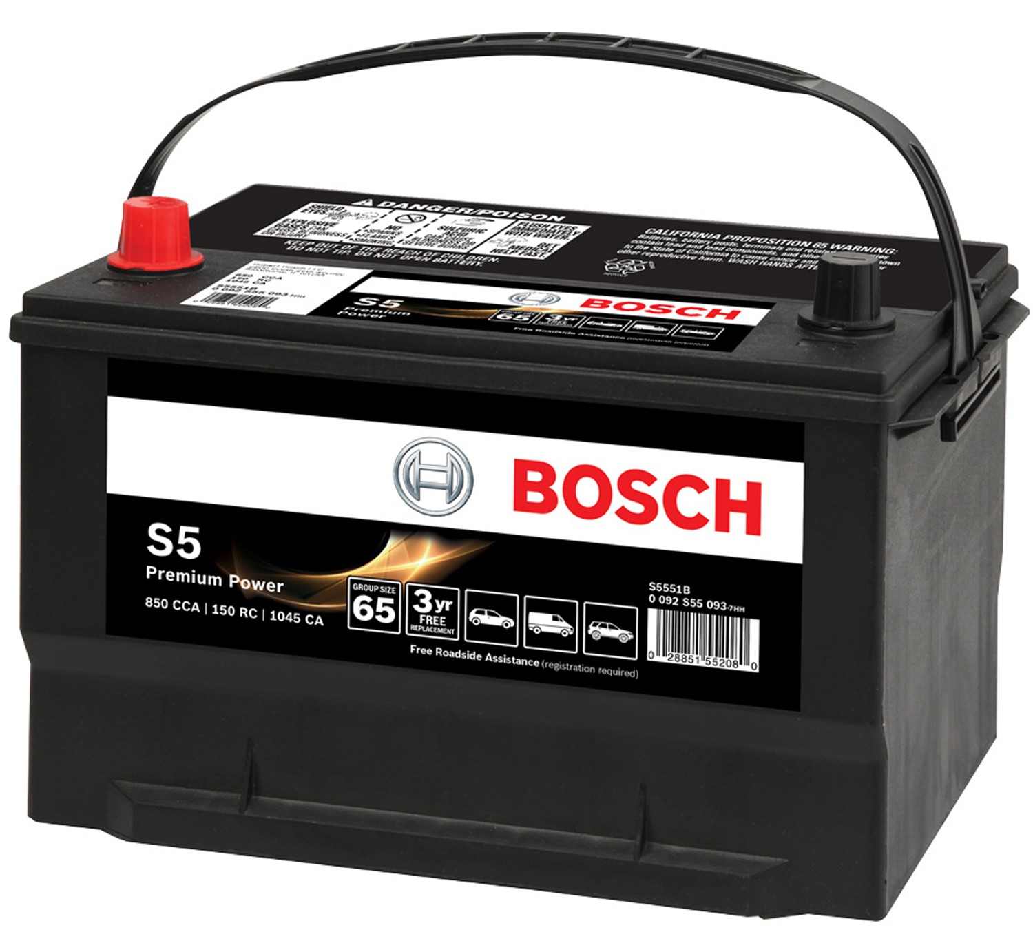 The Bosch S5 Battery is the powerhouse for recent car models with high electronic demand that provides optimum starting power and long service life, flushed tops for minimized risk of acid leakage, dependable power in accordance with OEM requirements, free roadside assistance and a 3 year free replacement warranty. It uses full frame grid technology, highly protective pocket separators and robust connections inside to extend lifetime and maximize reliability. | Bosch Premium Performance Starter Battery for Optimal Starting Power
