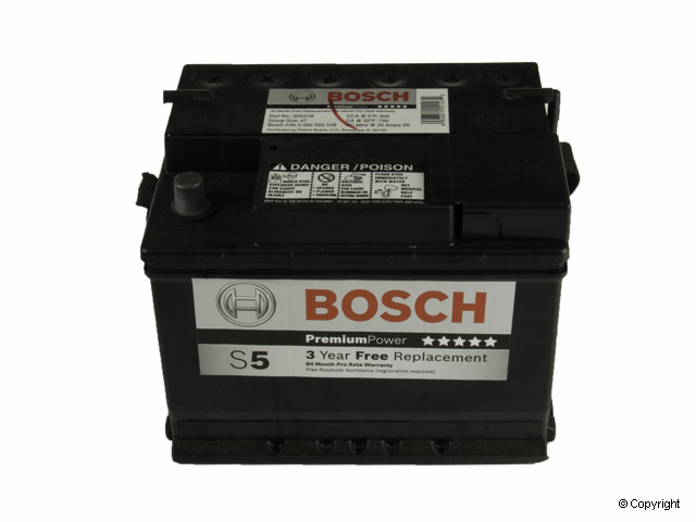 The Bosch S5 Battery is the powerhouse for recent car models with high electronic demand that provides optimum starting power and long service life, flushed tops for minimized risk of acid leakage, dependable power in accordance with OEM requirements, free roadside assistance and a 3 year free replacement warranty. It uses full frame grid technology, highly protective pocket separators and robust connections inside to extend lifetime and maximize reliability. | Bosch Premium Performance Starter Battery for Optimal Starting Power