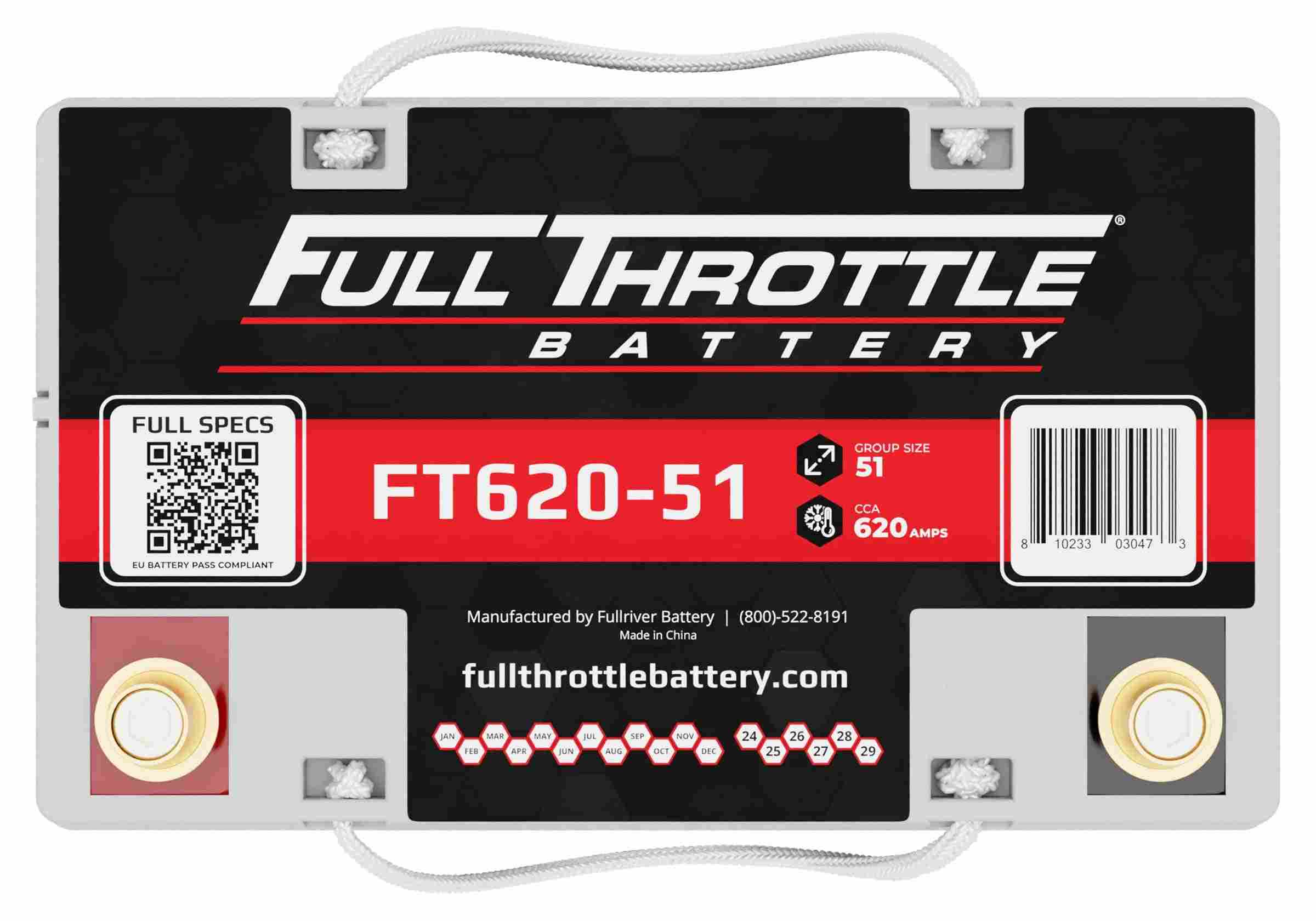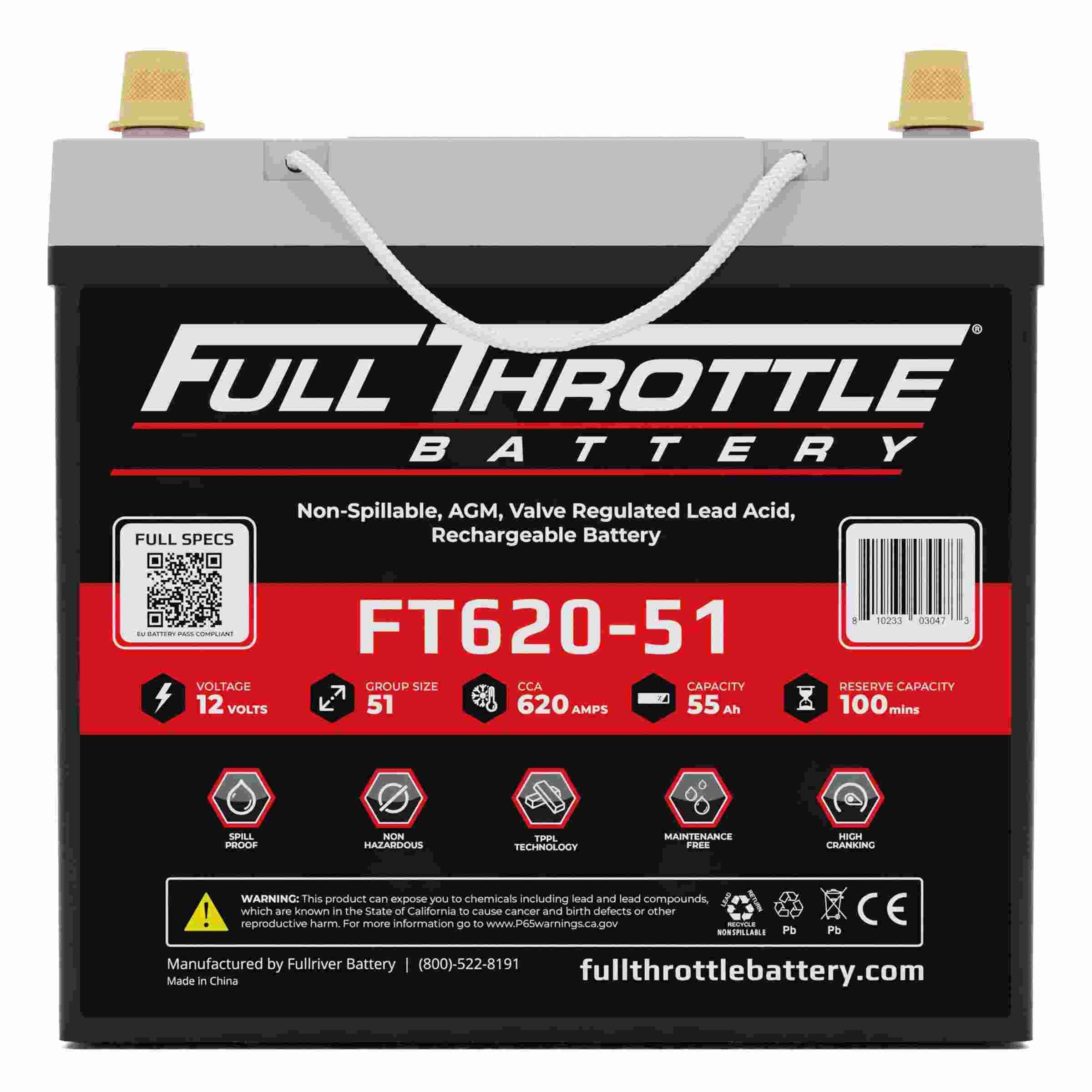 Full Throttle 12V Battery, Group 51, 620CCA, 55AH, Brass SAE Terminal LHP The Full Throttle Series batteries were designed from the ground up to handle the increasing demands of today's vehicles. Built with high-compression cells and a heavy-duty case, they stand strong in the face of shock and vibration. Pure-lead cells and thin-plate technology deliver reliable power, again and again, to meet the highest level of demand. | Full Throttle Agm Grp 51