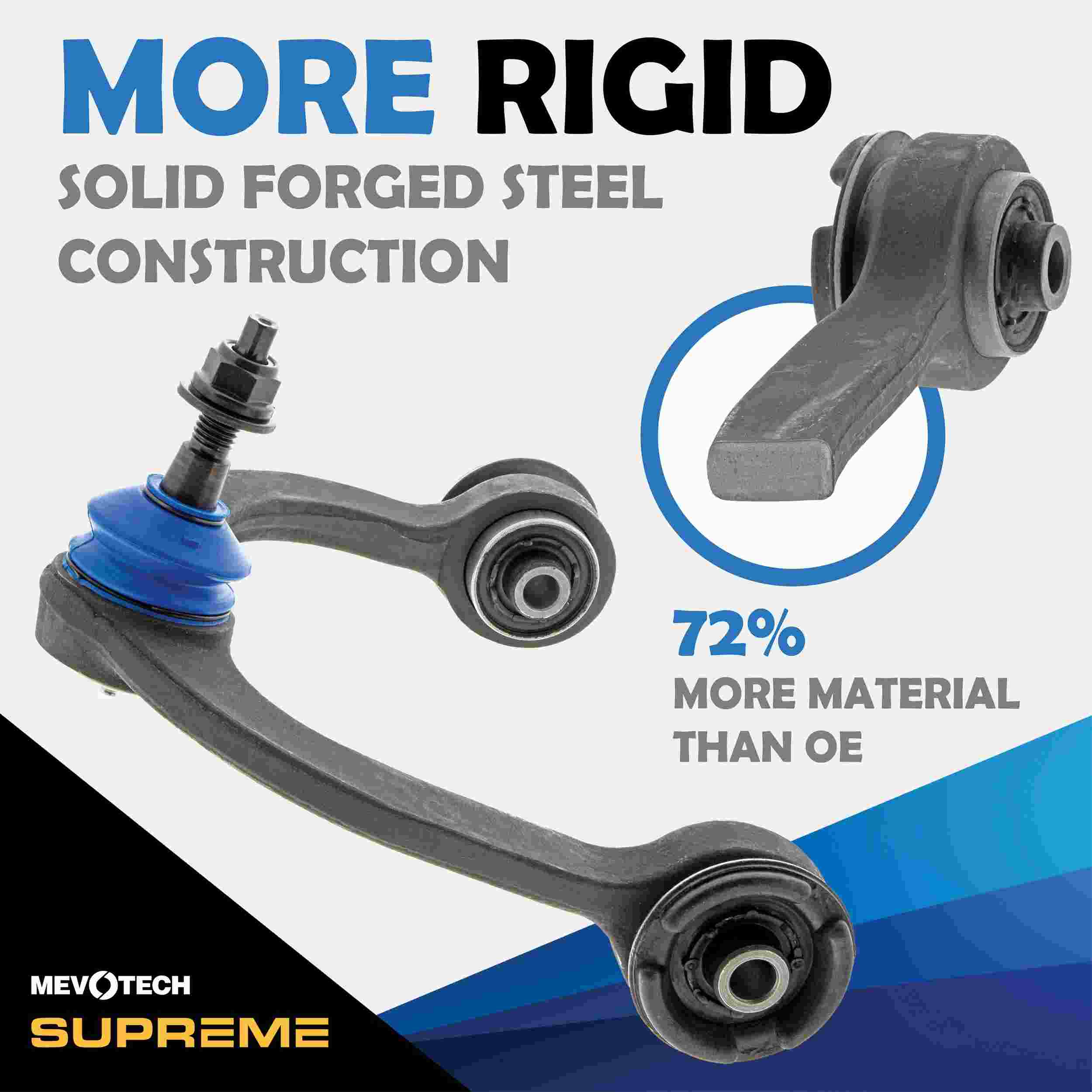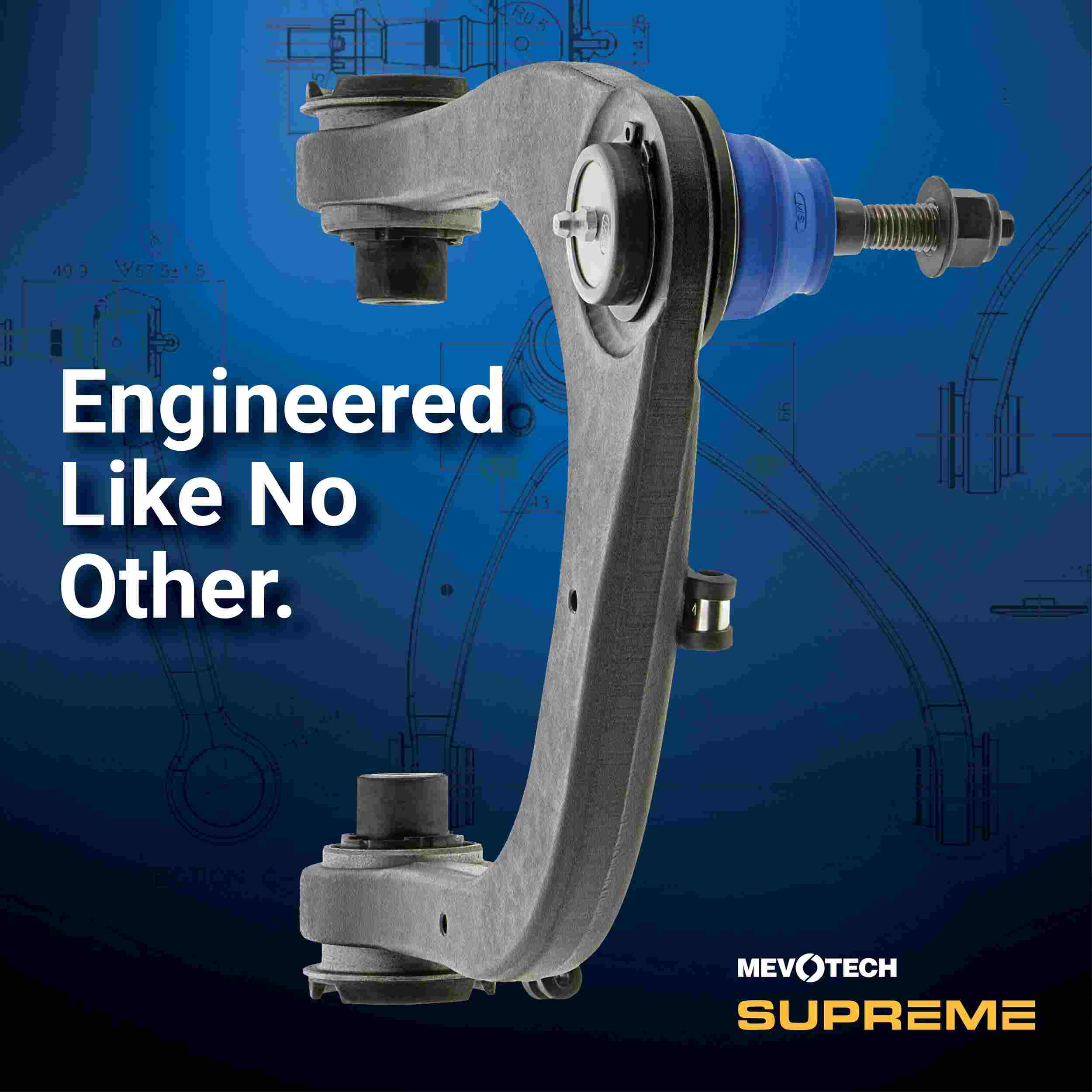 Suspension Control Arm and Ball Joint Assembly Mevotech Supreme Parts are engineered in-house, with application-specific upgrades for increased durability and performance. Mevotech Supreme control arms are built for high-usage commercial and passenger vehicles, SUVs, fleets and working trucks. Plus, innovative Labor Saver designs, tools and hardware make installations faster and easier. | Suspension Control Arm and Ball Joint Assembly
