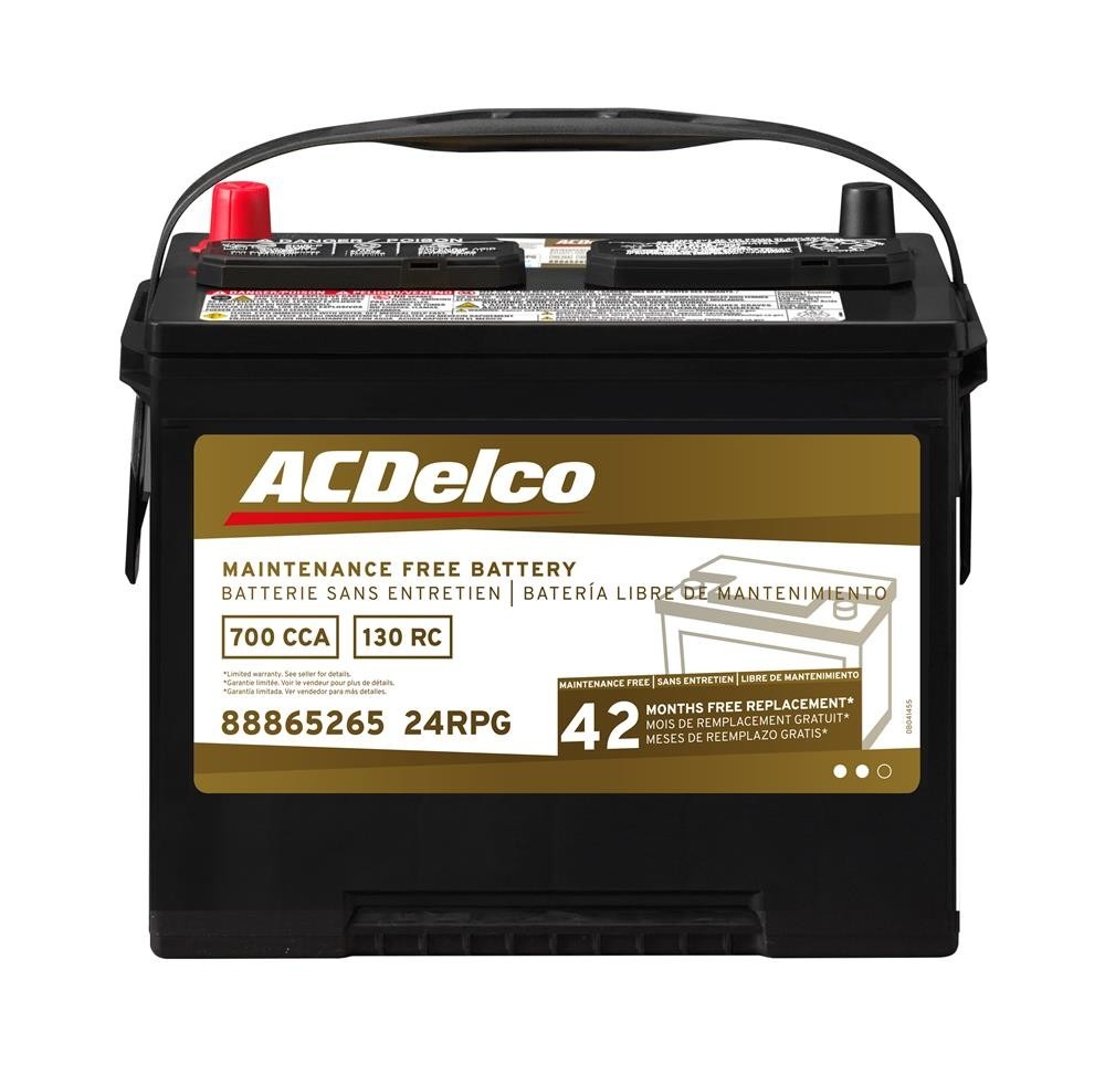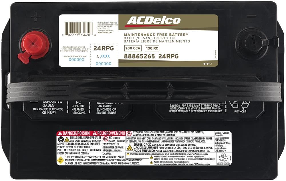 The ACDelco Gold Batteries are a high quality alternative to Original Equipment (OE) parts. These batteries feature an impact- and break-resistant plastic case for durability, including robust separator envelopes for extended auto battery. With a terminal design that resists acid leaks, seepage corrosion and black post, the ACDelco Gold Battery delivers maintenance-free performance and peace of mind. Integral gas separators and flame arrestor vents help prevent possible damage from outside sparks. Premium technology in the metal alloys and a higher amount of Lead, create an impressive performance, even in the coldest temperatures, and allow for more power use in a 'key off' environment. The ACDelco Gold Battery is an ideal replacement auto battery for car and truck applications. ACDelco Gold parts are manufactured to meet your expectations for fit, form, and function, making them a smart choice for General Motors vehicles, as well as most makes and models, including special applications. These high-quality parts are backed by General Motors. Some ACDelco Gold parts may have formerly appeared as ACDelco Professional. ⚠<b> PROPOSITION 65 WARNING:</b> Battery posts, terminals and related accessories contain lead and lead compounds, chemicals known to the state of California to cause cancer, birth defects and other reproductive harm. Batteries also contain other chemicals known to the state of California to cause cancer. Wash hands after handling. | Gold BCI Group 24R Battery