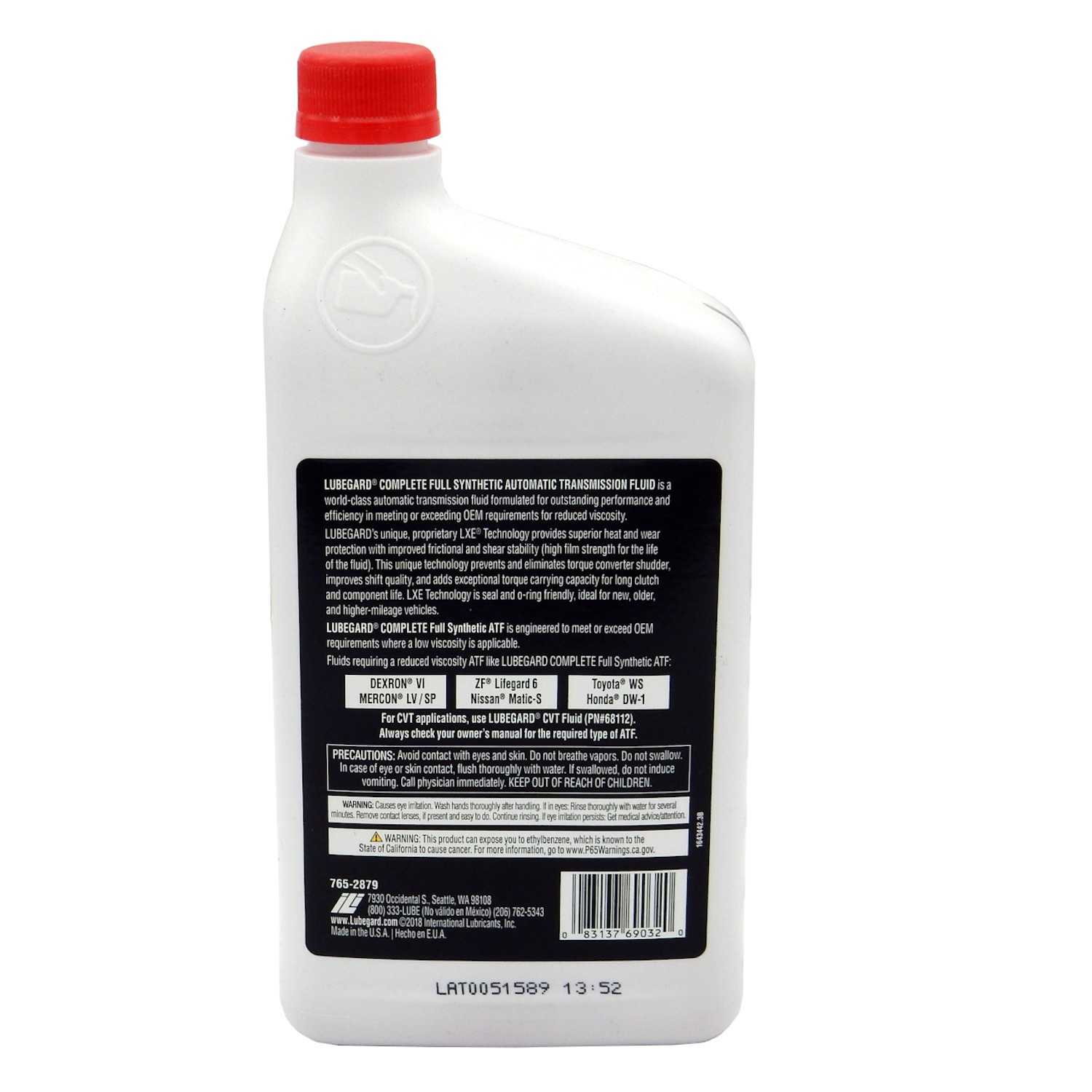 WARNING: This product can expose you to ethyl benzene, which is known to the State of California to cause cancer. For more information go to www.P65Warnings.ca.gov. | Lubegard Full Syn Atf Qt.
